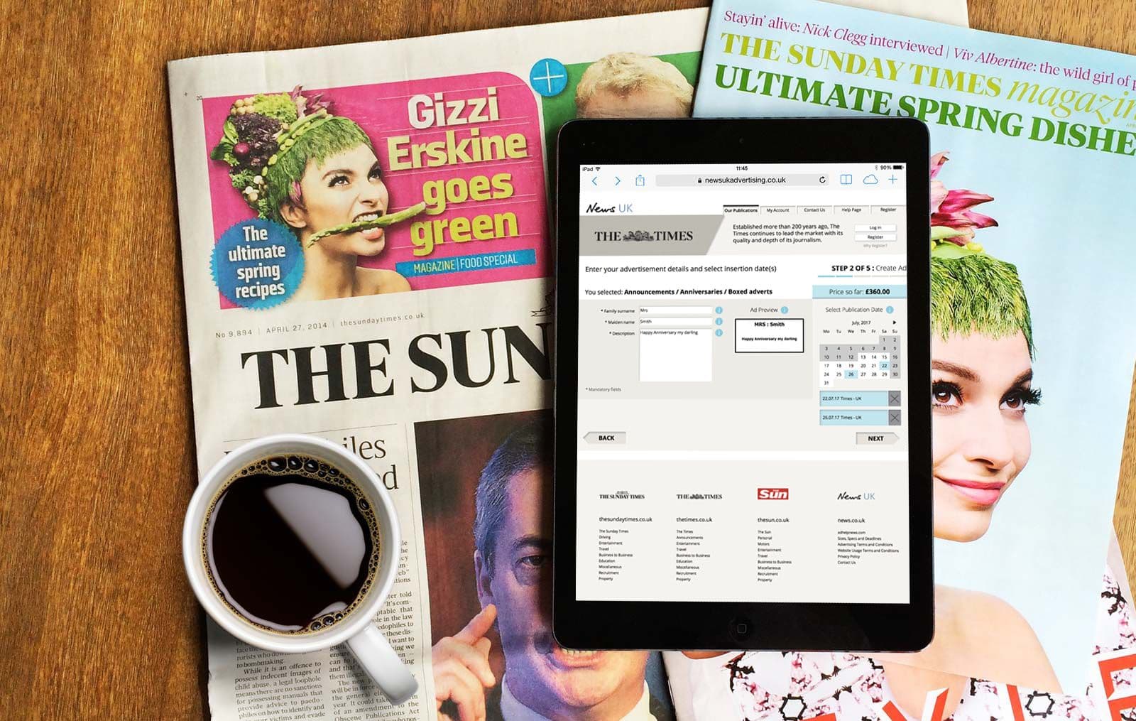 Felix&Friends delivered a complete ad booking website enabling clients and customers to book classified advertisements and announcements through a dynamic, flexible and intuitive platform. The system serves all classified ad bookings across News UK's major titles: The Times, The Sunday Times and The Sun. This consolidation provides advertisers with streamlined access to multiple publications through a single, efficient booking interface.